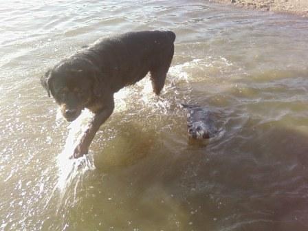 На море Дуся уже сама заходит в воду. А в первый раз она зашла за мной. Там, куда мы ходим, очень мелко. Первым всегда летит в воду наш ротвейлер Лорд-большой любитель купания.